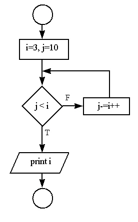 (15) Write a complete C program that implements the following flowchart. What is the value of i and j upon completion?