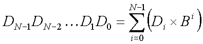 Here we have an N-digit number written in base B. The ith digit, Di, is one of the symbols representing the integer values {0..(B-1)}.